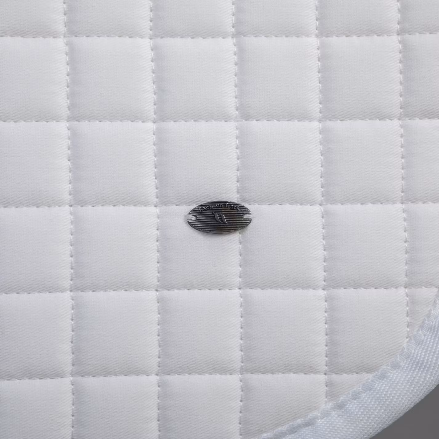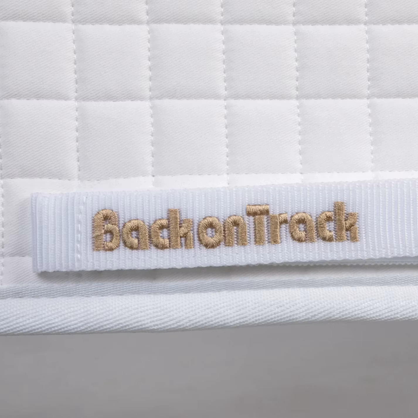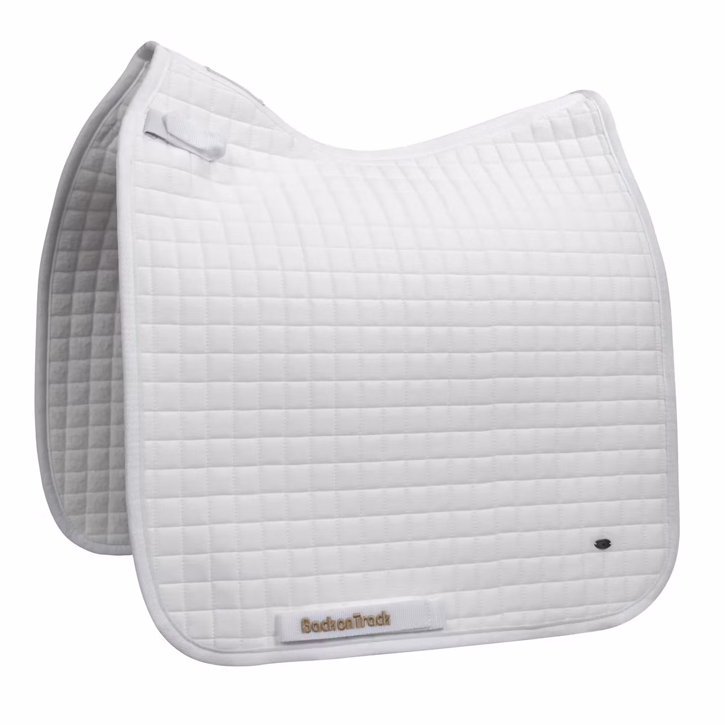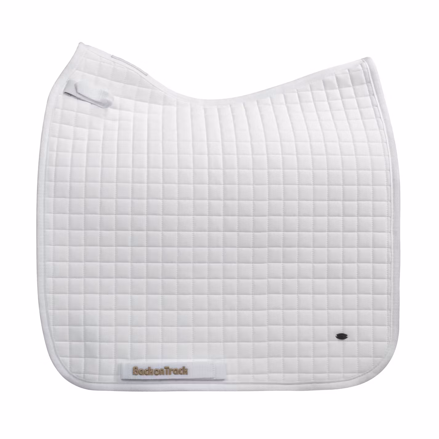 Schabraket är vitt med ett litet metallemblem på sidan, samt Back on Track-logo på remmen för sadelgjorden. Ett perfekt schabrak för både träning och tävling.