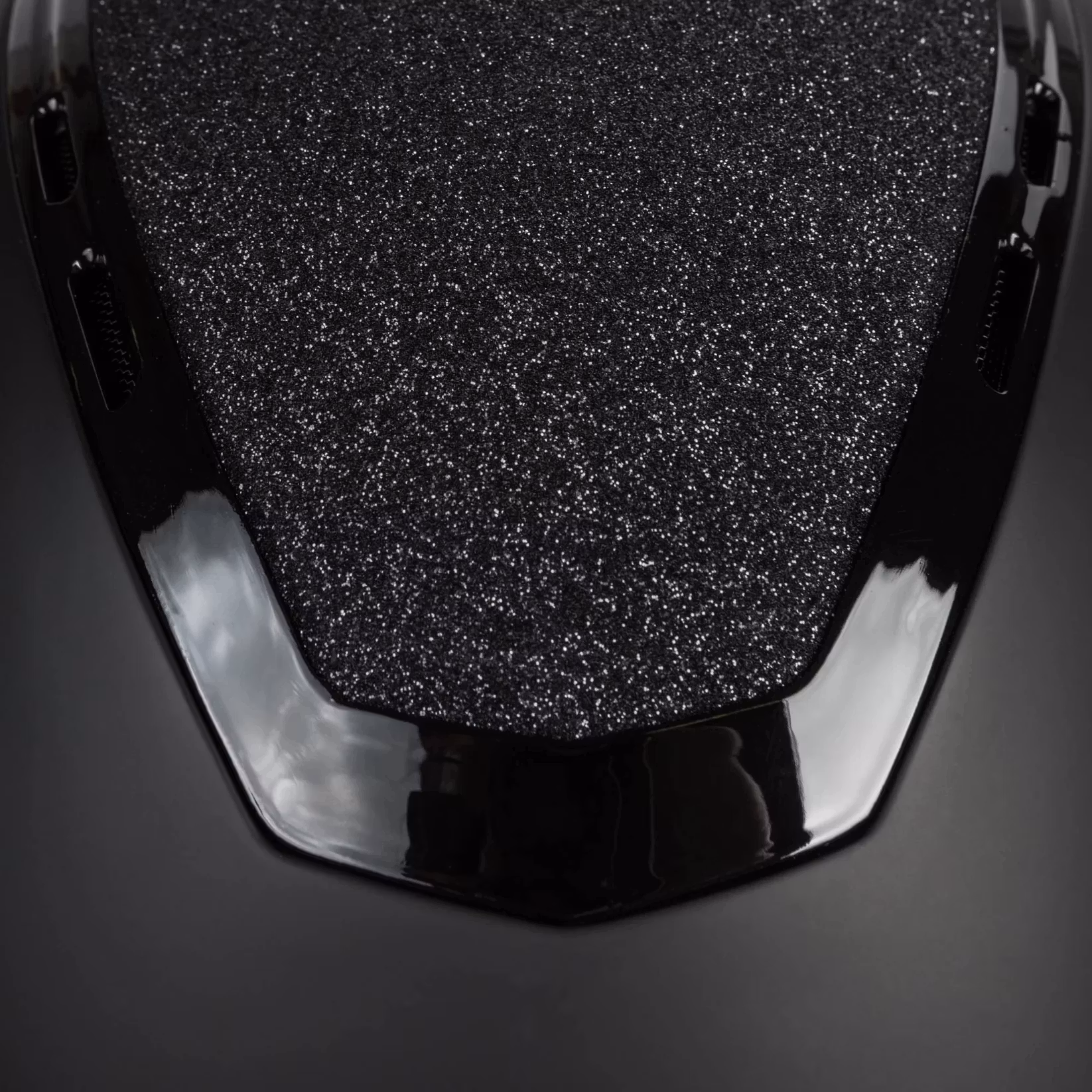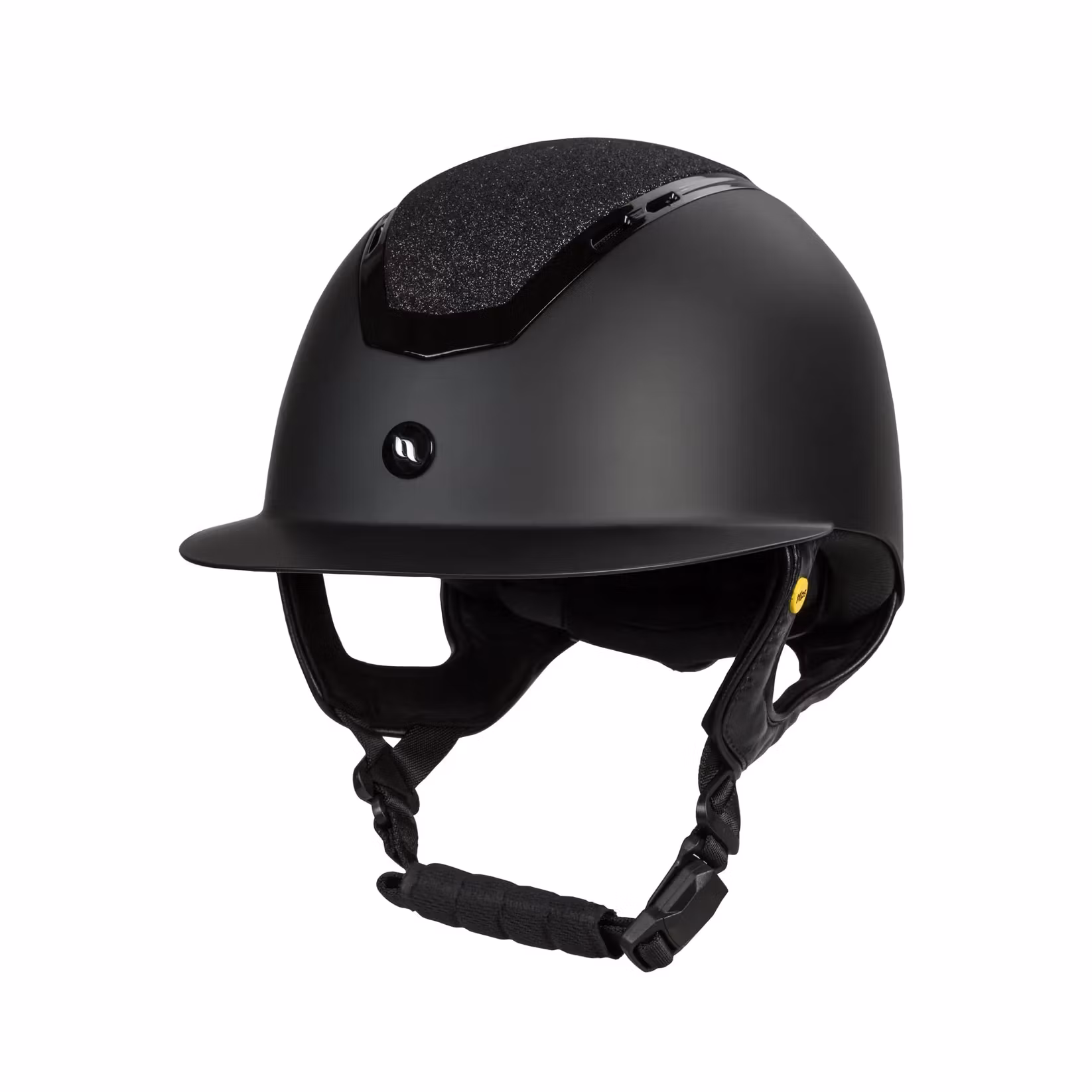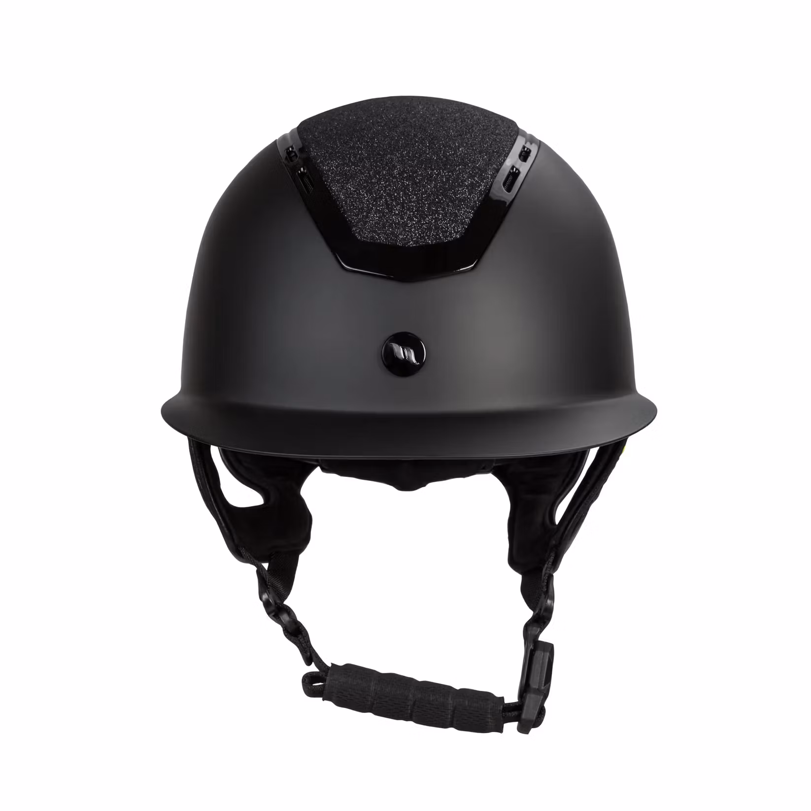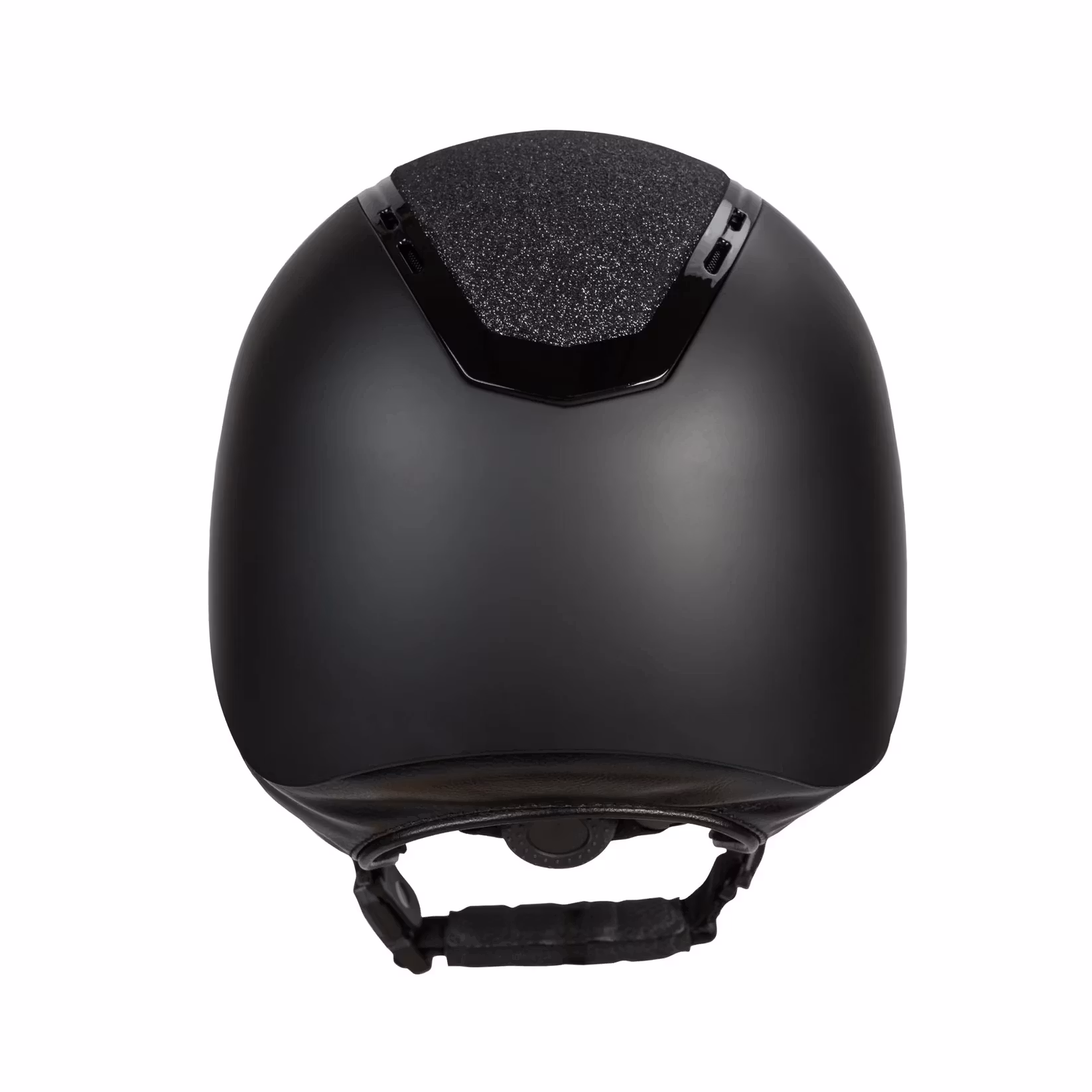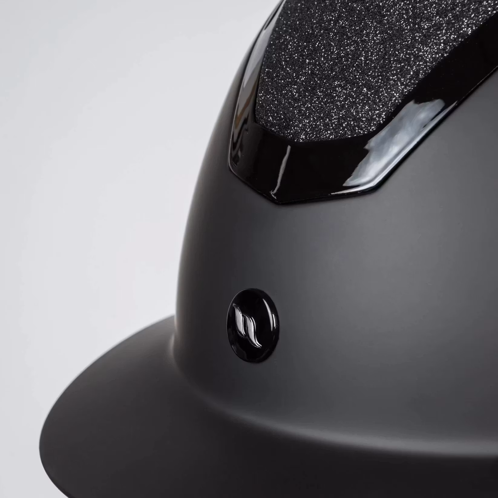 ”Caracas” är en mattsvart hjälm som kännetecknas av sofistikerad och nedtonad glamour. Ventilationsöppningarna är integrerade i ett dekorativt högblankt band som omger en mittsektion prydd av fint, svart glitter.